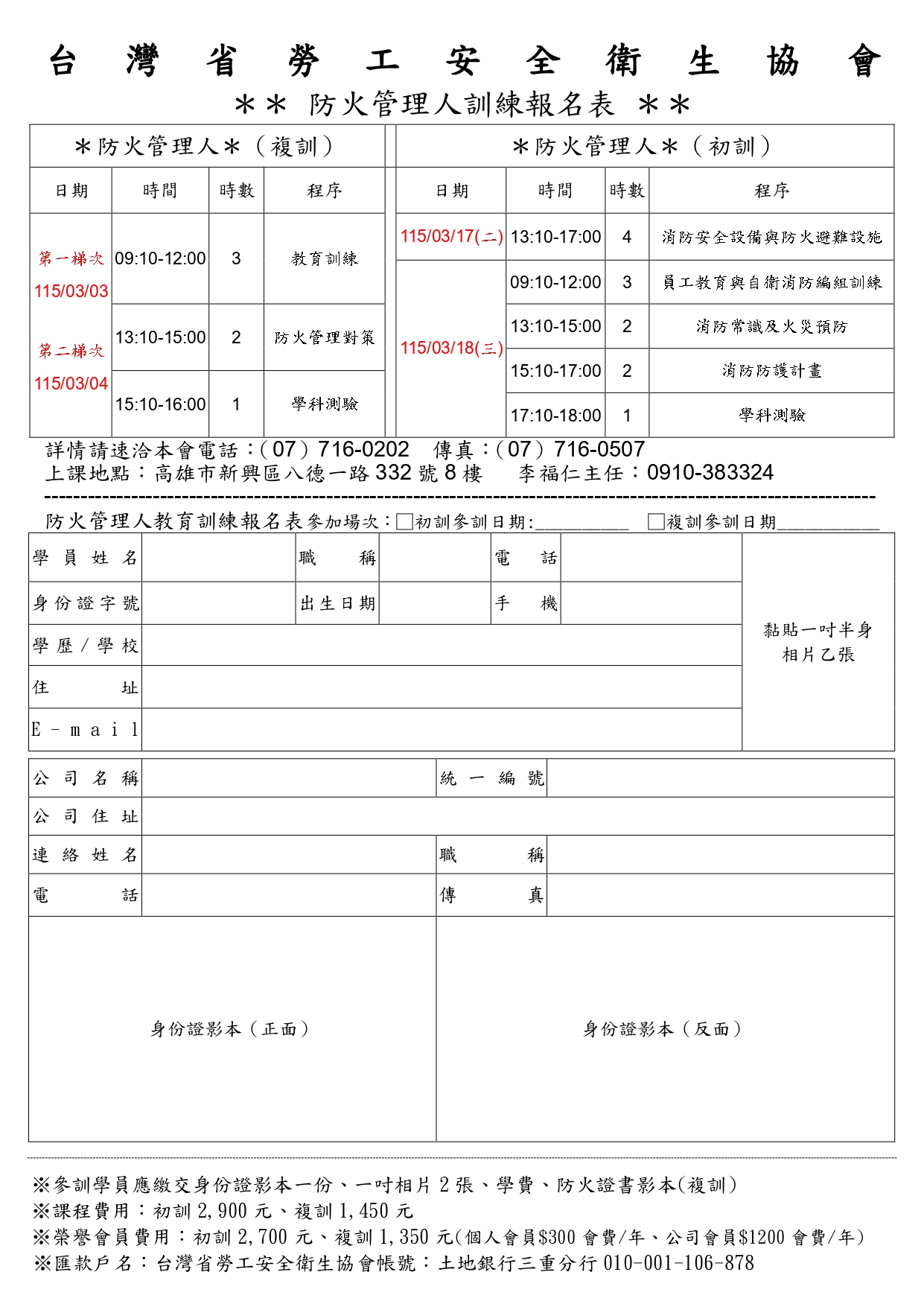 | 課程名稱 | (複訓) 防火管理人 *開課日期:115/03/04(三) |