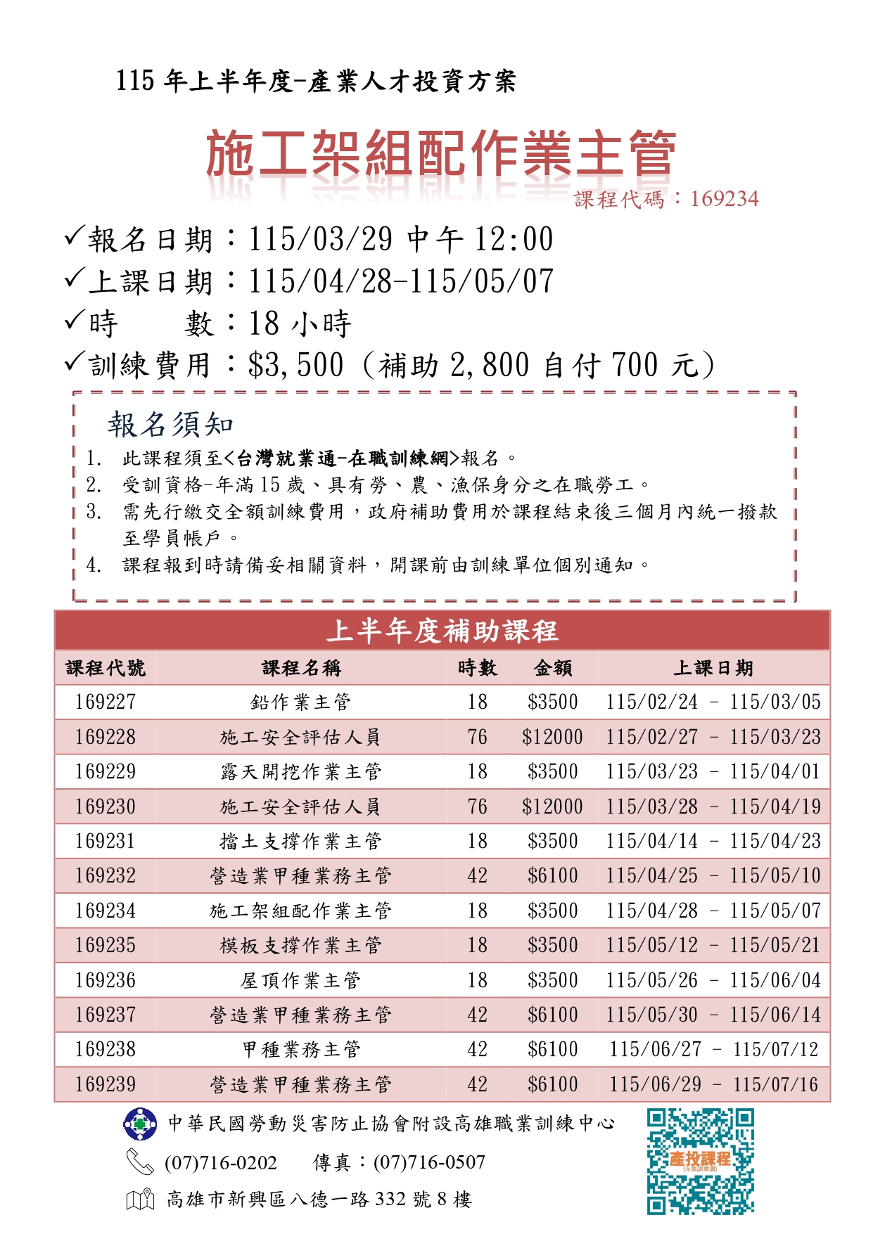 | 課程名稱 | (產投補助) 施工架組配作業主管教育訓練班第01期 *開課日期:115/04/28-115/05/07 |