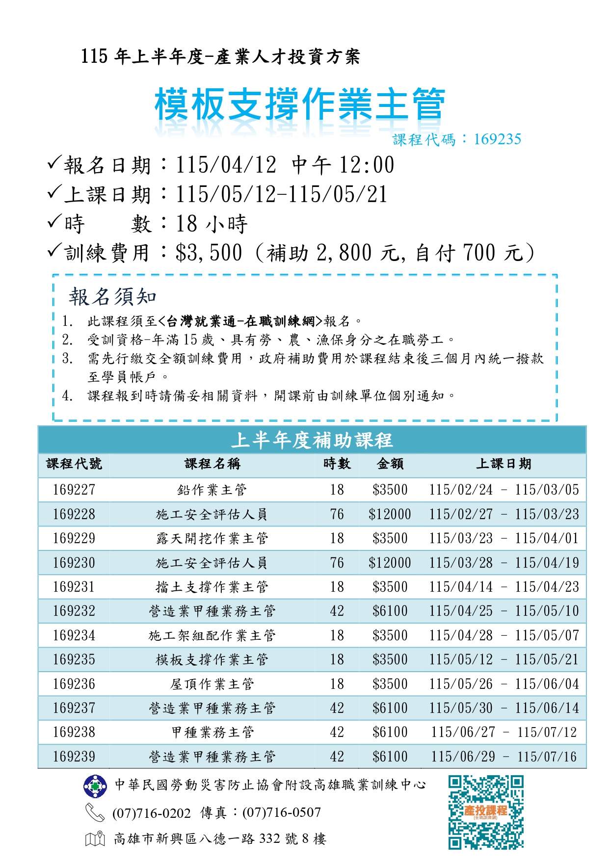 | 課程名稱 | (產投補助) 模板支撐作業主管教育訓練班第01期 *開課日期:115/05/12-115/05/21 |