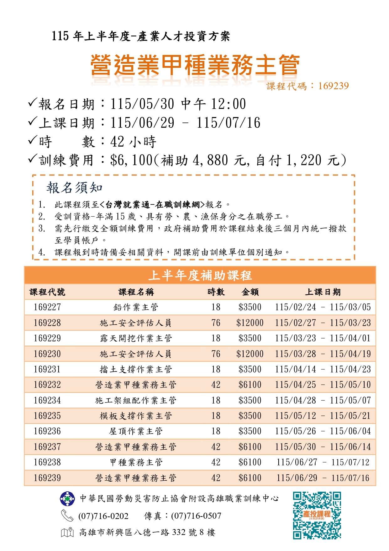 | 課程名稱 | (產投補助) 營造業甲種職業安全衛生業務主管教育訓練班第03期 *開課日期:115/06/29-115/07/16 |