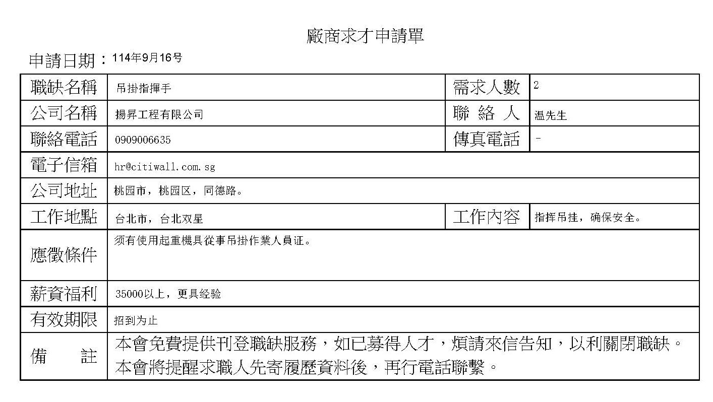 > 求職求才 > 廠商-求才資訊 > 揚昇工程有限公司-吊掛指揮手